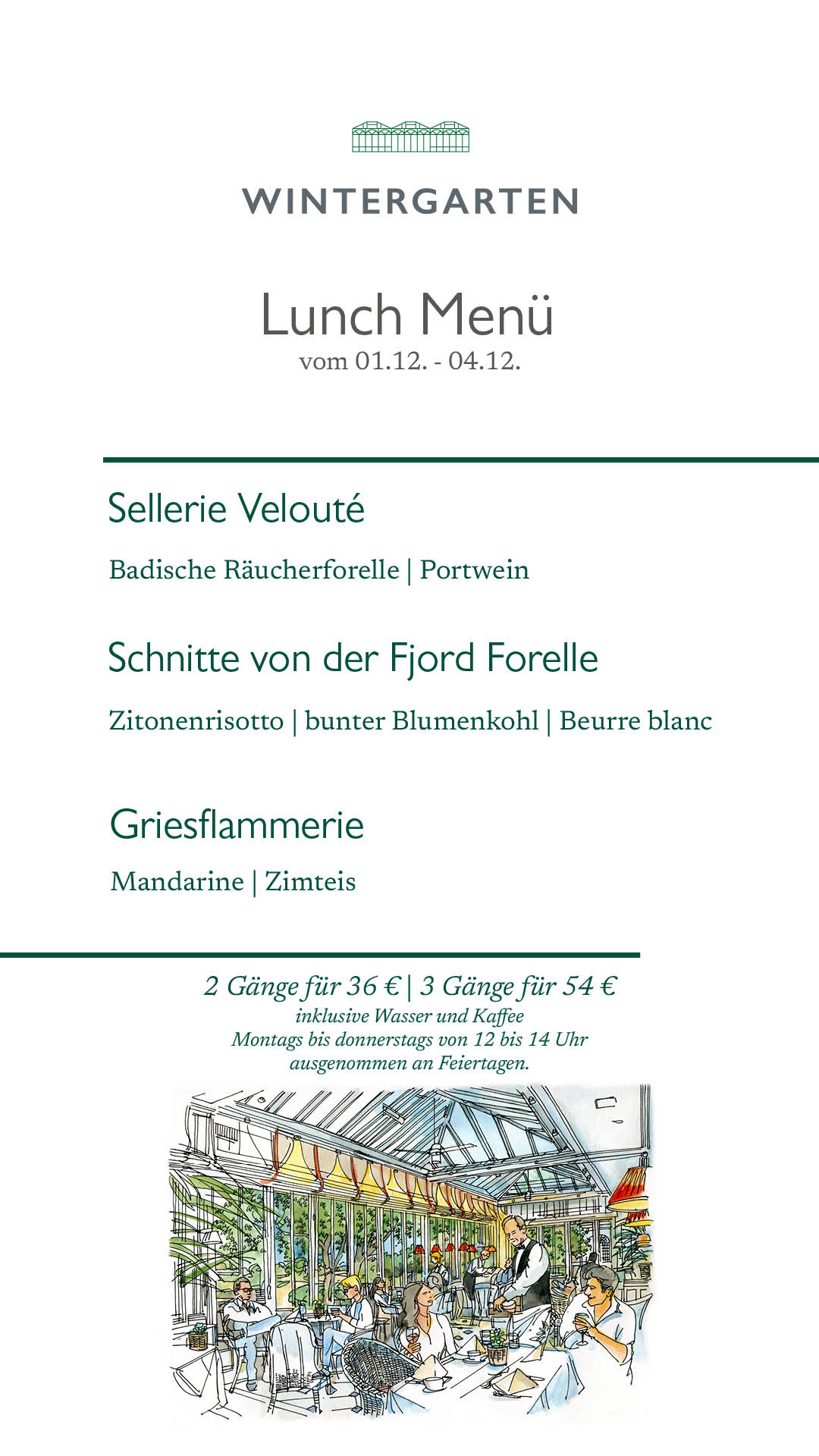 Mit Blick auf die weltberühmte Lichtentaler Allee und erfüllt von natürlichem Sonnenlicht sind das Restaurant Wintergarten und seine Parkterrasse ein atemberaubender Ort zum Dinieren. Hier kreieren die Köche ihre eigene Grande Cuisine, indem sie Gourmet-Spezialitäten aus der Region mit französischen Einflüssen und modernen Akzenten verbinden – stets mit den besten Zutaten aus der Region.